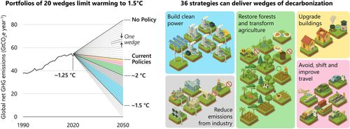 Global decarbonization can be divided into climate wedges, with 36 strategies able to deliver at least one wedge. / SOURCE: Nathan Johnson and Iain Staffell, Imperial College London